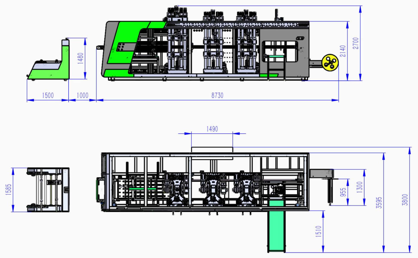 The station mold closing, forming auxiliary stretching, and pull-tab parts are all driven by servo motors, which have fast speed, low noise, high precision, and high efficiency.